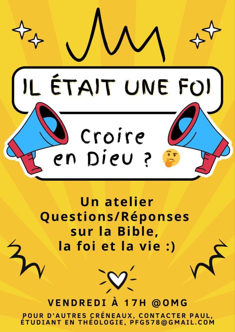 Est-il possible qu’un Dieu existe ? Comment y croire ? Des questions que chacun s’est un jour posées. Tu aimerais comprendre ce qu’en dit la foi chrétienne ? Ou simplement confronter ton opinion avec celui de la foi chrétienne ? Paul nous invite tous les vendredis à 17h à participer à son atelier « Il était une foi ».